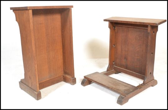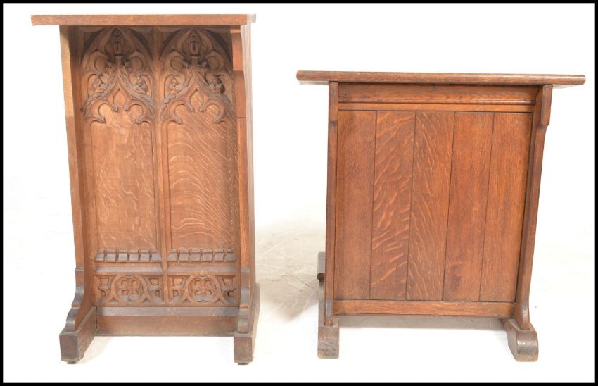 A 19th Century Victorian gothic ecclesiastical church oak prayer desk, two panels to the front with carved gothic pugin style arches in relief together with another oak prayer desk / prie dieu of simple form having fret pierced decorative uprights. Removed from St Philip and St Jacob Church Bristol.  Measures 96 x 54cms x 42cms