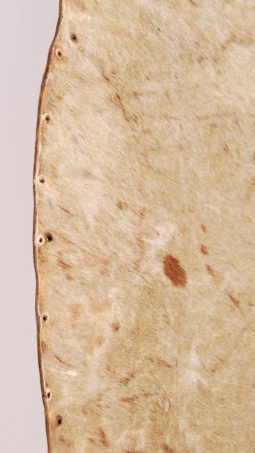 A 19th century African Anglo Zulu Nguni people war or warrior shield also know as Isihlangu, Ihawu or Ingubha in Zulu, and Ikhaka or Ikhawu in Xhosa. The shield comprising of an ovoid raw cowhide from the Sanga Nguni cattle being pierced and leather weaved with wooden pole handle to the reverse. The front having two columns of small horizontal slits through which leather loops secure the central wooden pole. Measures; 84cm x 59cm