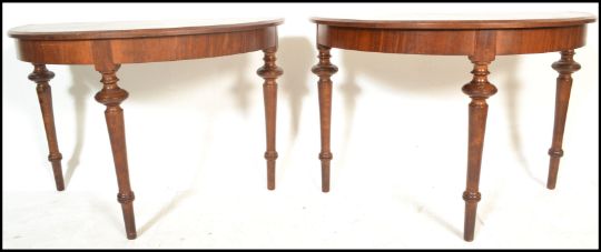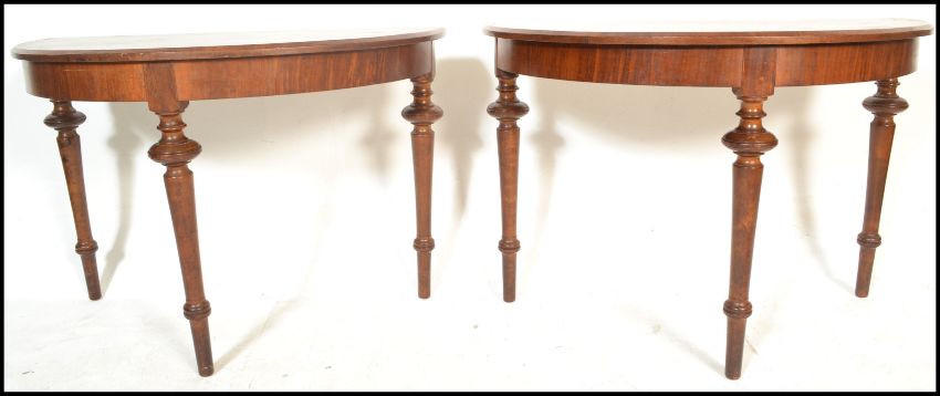 A pair of 19th Century Victorian mahogany dining table D ends originally an extending table, the demi lune mahogany tops raised on ring turned upright tapering supports.