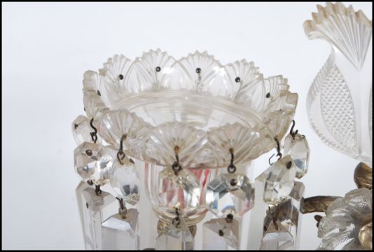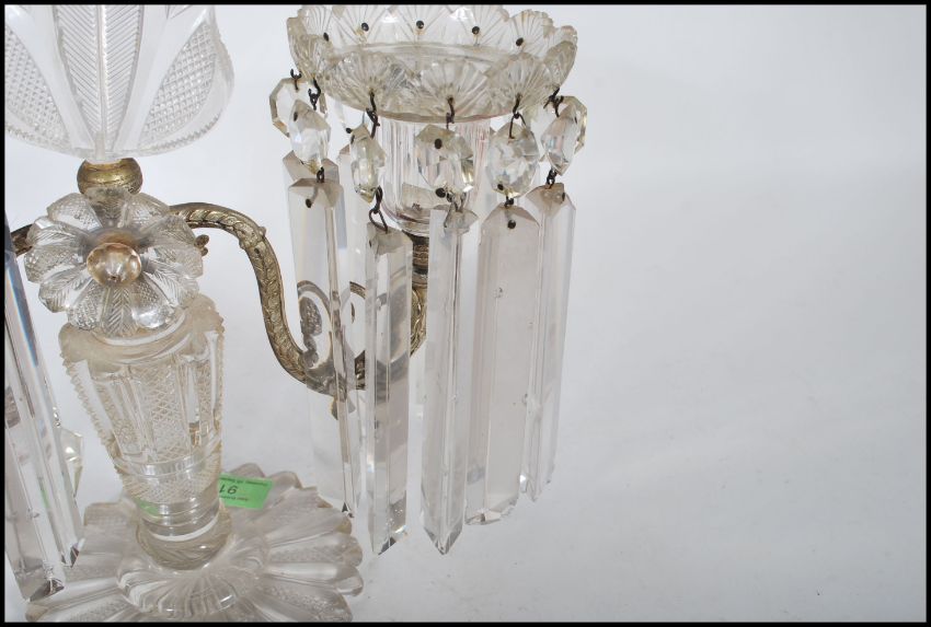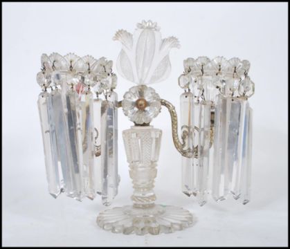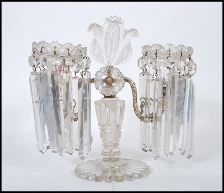 A 19th Century Victorian twin branch table centerpiece lustre with clear glass droplets, raised on a bulbous cut glass stem with a thistle top.