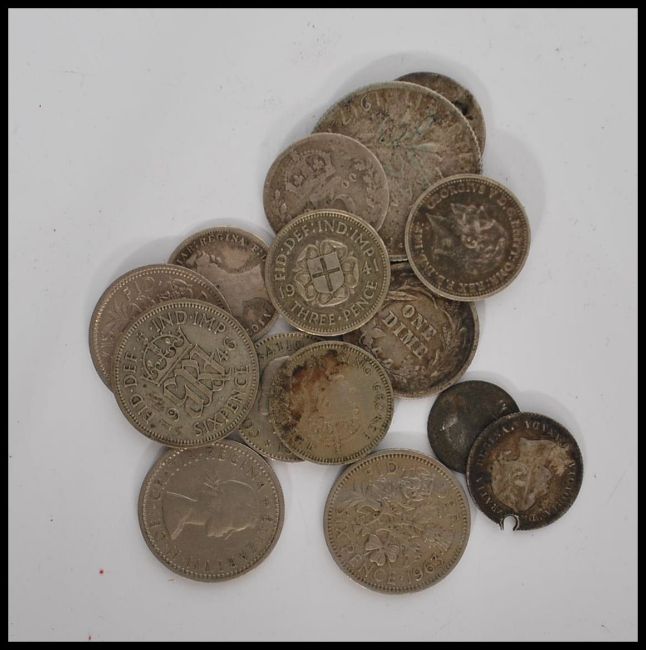 A small group of pre decimal and later coins, mostly British dating from the 19th Century Victorian to include silver coins, Shillings, Half crown, pence etc. Together with other world coinage German, American, Chinese, Romanian , French etc.