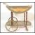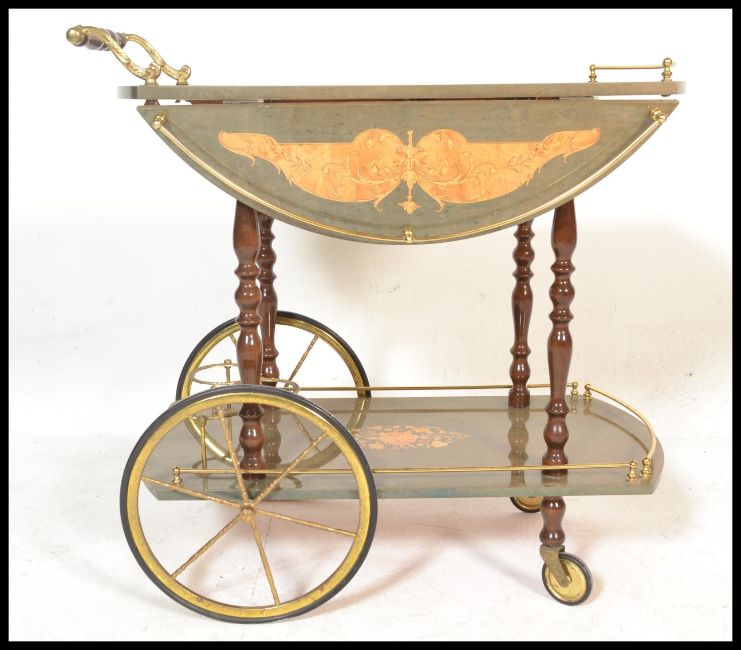 A retro 20th Century Italian style marquetry inlaid two tier drinks trolley with gilt metal mounts having sectional bottle holders to the lower tier raised on graduating wheels with handle to front. Measurements are 75cms H x 80cms W x 45cms D