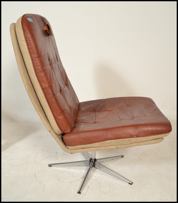 A mid century Danish oxblood leather swivel armchair being raised on a five point chrome base together with a leather upholstered Danish bentwood cantilever armchair.