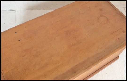 A 19th Century Victorian pine blanket box chest, hinged top with open storage, carry handles to the side raised on plinth base. Measures: 45 cms tall x 96 cms wide x 48 cms deep