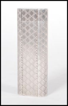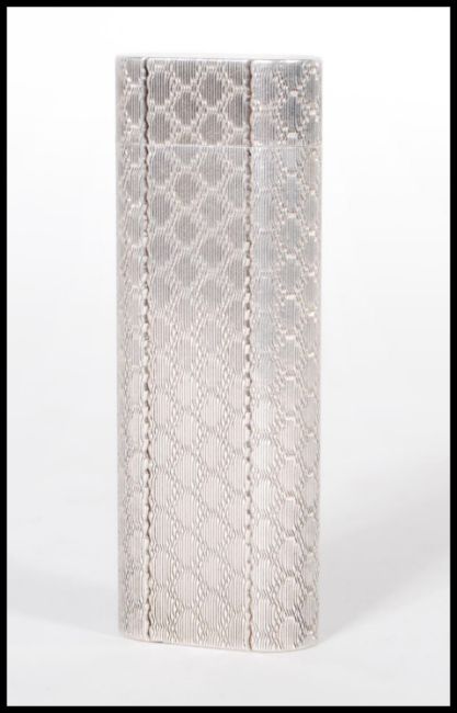 A silver plate lighter by Cartier Paris. The lighter of flattened cylindrical form having engine turned matted decoration. Marks to base for Cartier number 48096 A Swiss made. Measures 7cm tall.