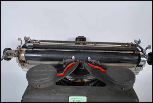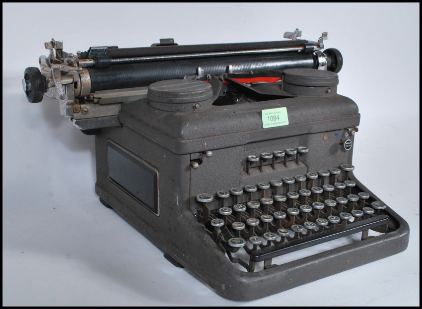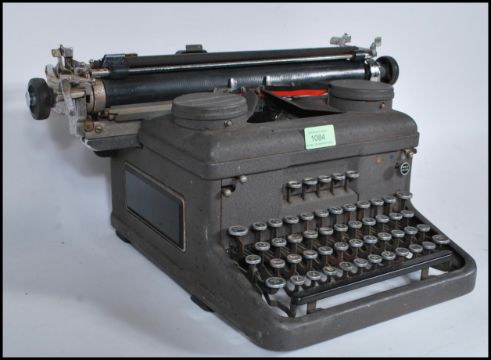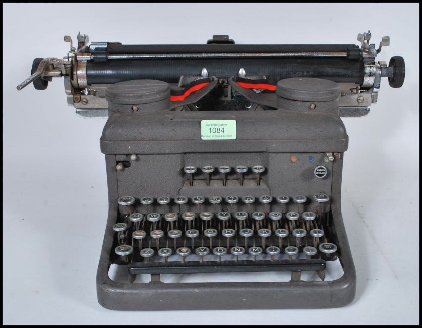 A Vintage early 20th Century Circa 1930s industrial Typewriter machine by "Royal" having glass set panels to both sides. Local supplier's name on reverse for Roberts of Bristol.