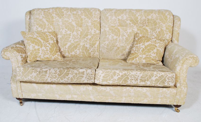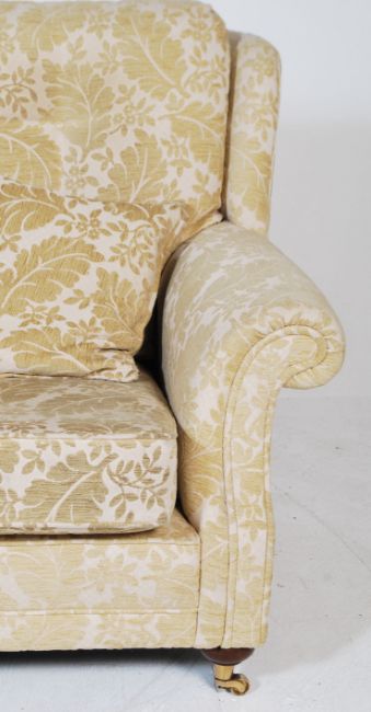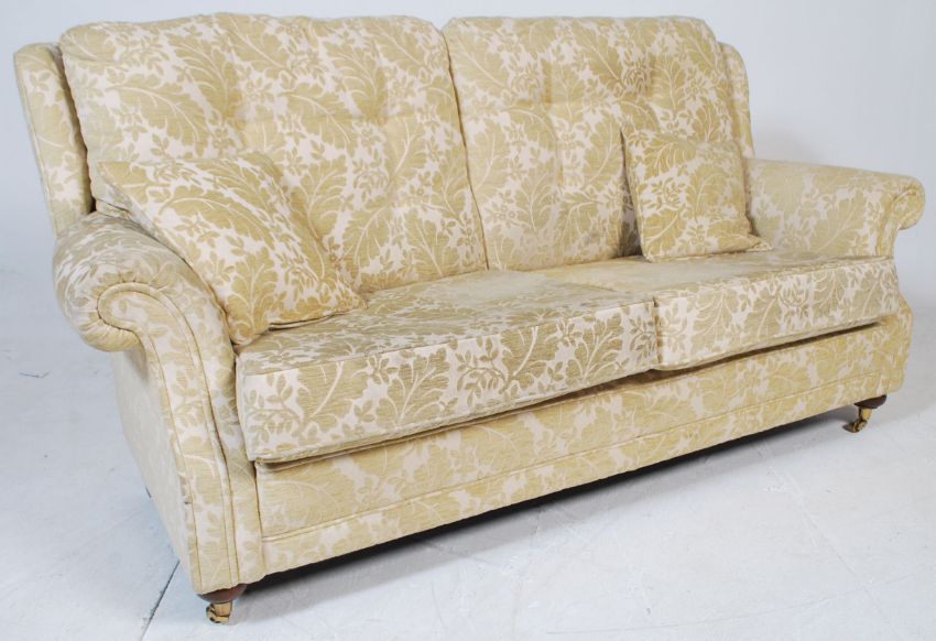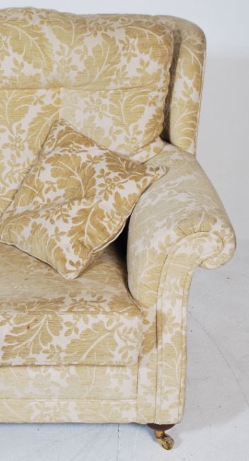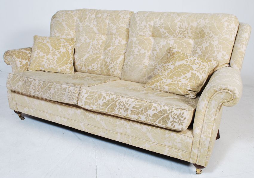 A pair of matching contemporary three seat scroll arm button back sofa settees in the manner of Wesley Barrell. Upholstered in a rich chintz material raised on bun feet terminating on brass castors.
