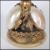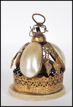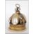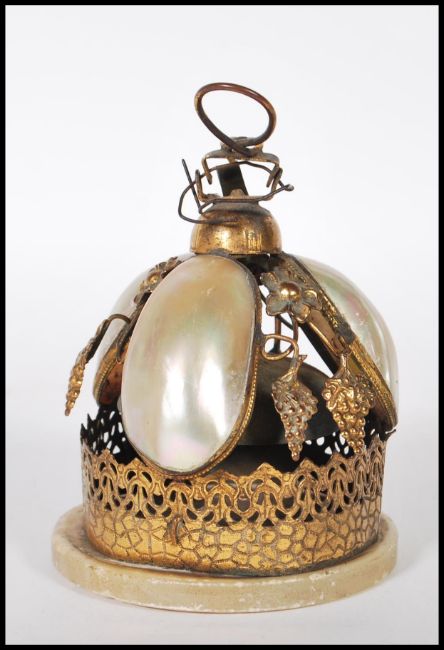 A turn of the Century high Victorian evening dinner bell having three mother of pearl shells with floral and grape gilt decoration. Raised on a curricular soapstone base with gilt pierced gallery. Measures 12.5cm tall by 9cm diameter.