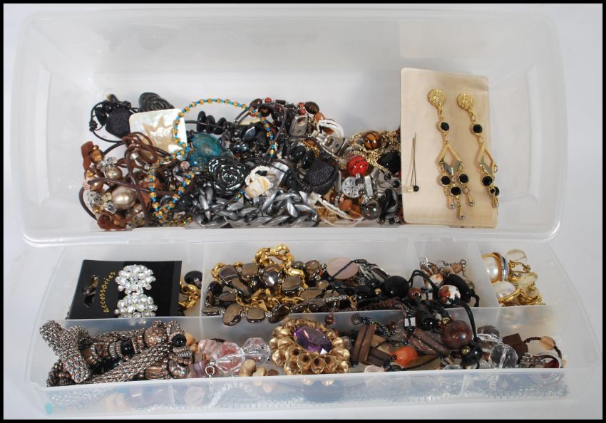 A collection of costume jewellery to include beaded necklaces two yellow Eva chain necklace and bracelet, dress earrings, a purple stone flower brooch glass bead necklaces etc.