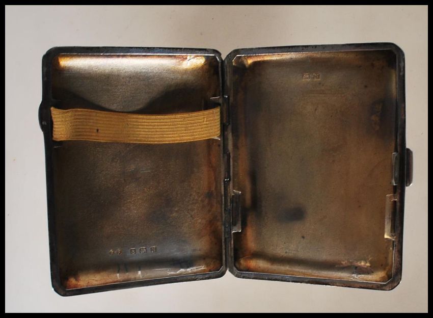 A circa 1930's Art Deco silver cigarette case of curved rectangular form having engine turned decoration with push button clasp and inscribed monogram B to top left. Hallmarks to gilt inner for Birmingham date letter N 1937, makers mark for Frederick Field. Weighs 60.2g. Measures 6.5 wide by 8.5cm wide.