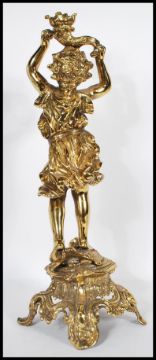 A late 19th / early 20th Century cast bronze candlestick modelled as a young girl in the classical flowing gown holding aloft her head a cornucopia shell which forms the candle sconce, raised on a rococo base.  Measures 50cm tall.