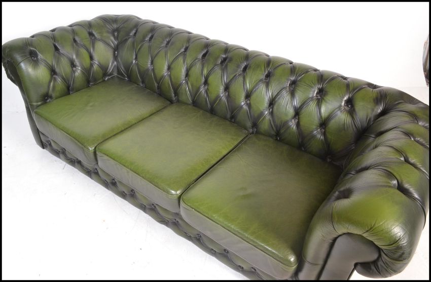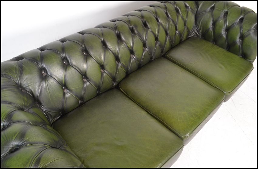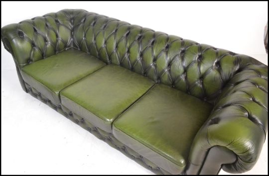 A 20th Century green leather upholstered chesterfield three seater sofa, having buttoned rounded back and arms being raised on castors. Measures: 75 cms tall x 197 cms wide x 90 cms deep