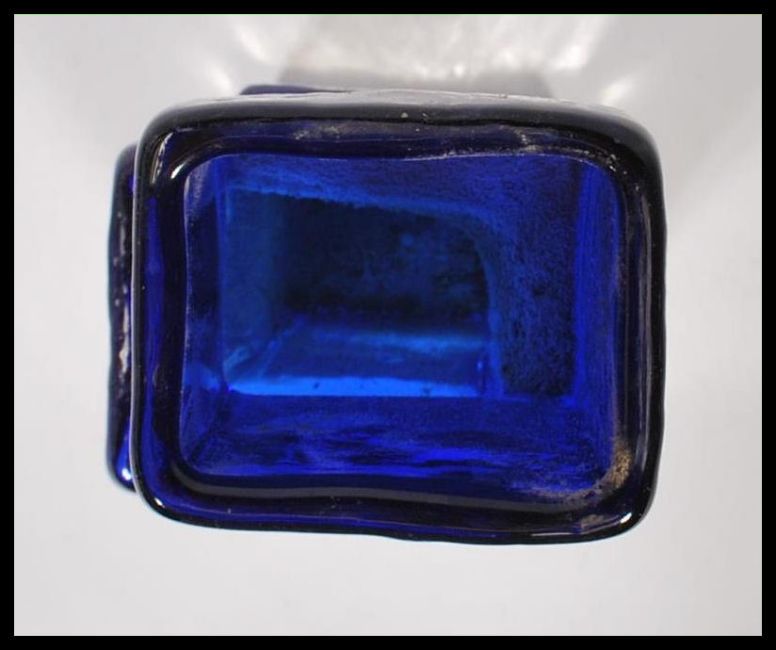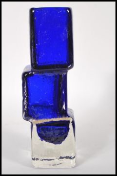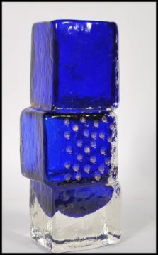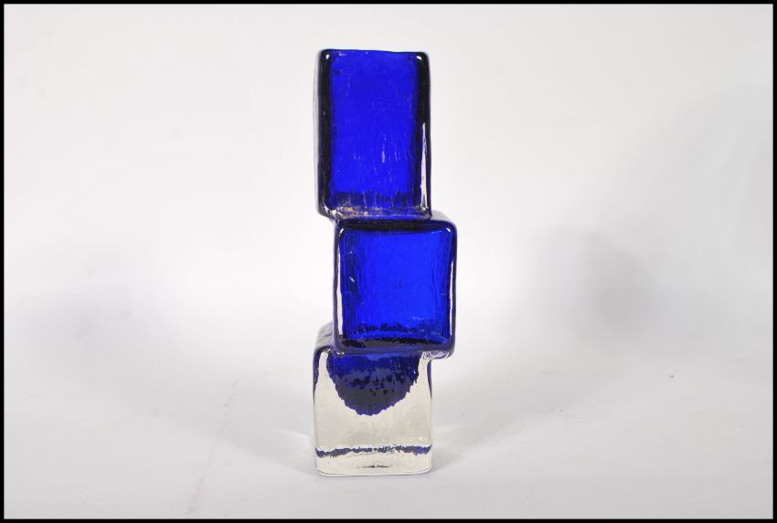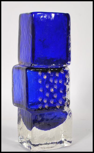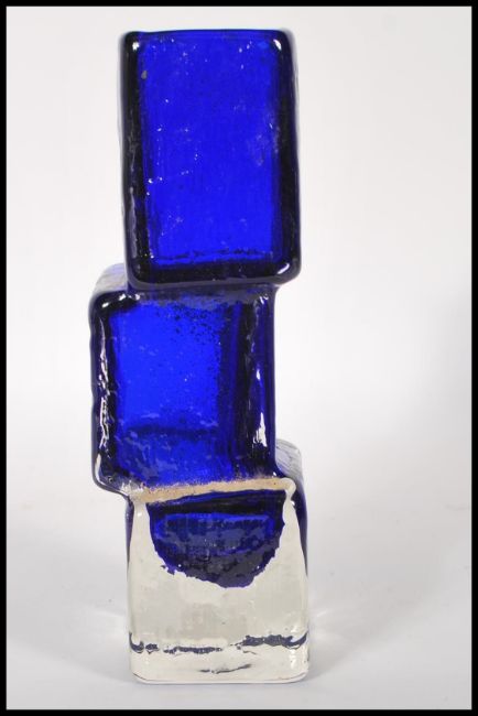 A vintage retro blue glass drunken bricklayers vase in the manner of Geoffrey Baxter for Whitefriars having bark effect texture. Measures 21.5cm tall.