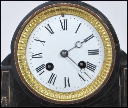 A late 19th Century high Victorian marble mantel clock having white enamel dial with Roman numeral chapter ring with round pierced hands and gilt raised border. The clock having a brass plaque presented in recognition of years service raised on a tick marble plinth base with gilt carved detailing. Movement striking the bell and being unmarked. Measures 24cm tall by 30cm wide.