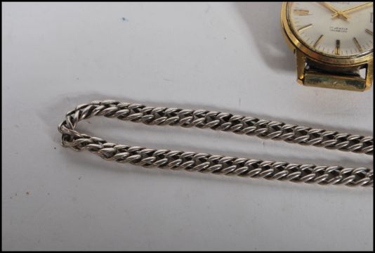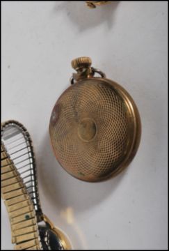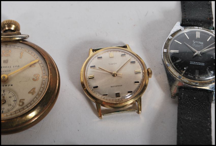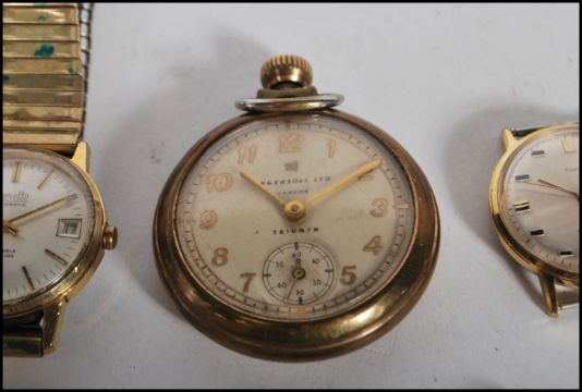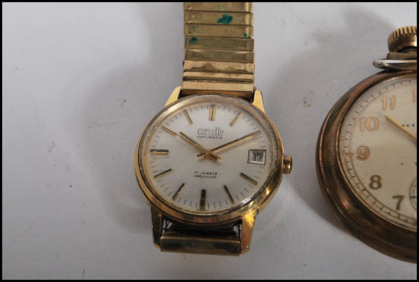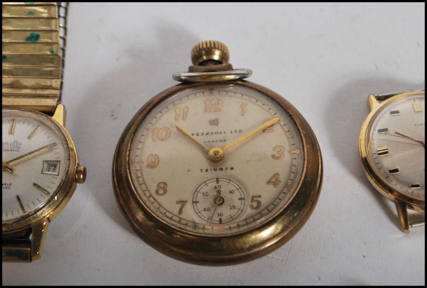 A group of three vintage 20th Century gents wrist watches to include a Services black faced calendar 17 Jewel wind up watch on black leather strap, a Corvette Automatic on expandable bracelet strap, Timex together with an Ingersoll Ltd Triumph open faced pocket watch and silver white metal fob chain with silver hallmarked fob medal.