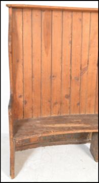 A 19th Century Georgian pine tavern wing settle of high back curved form having a plank back with shaped wing sides and solid bench.  Measures 165 cm high x 197 cm wide x 60 cm deep.