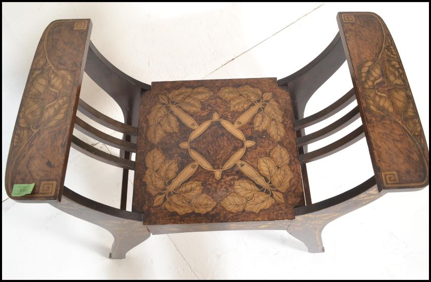 A 20th Century antique style Renaissance revival Dutch Marquetry inlaid style throne Savonarola chair, having a curved interlinked frame, with decorative foliate motifs. Measures: 72cms tall x 80cms wide x 41cms deep