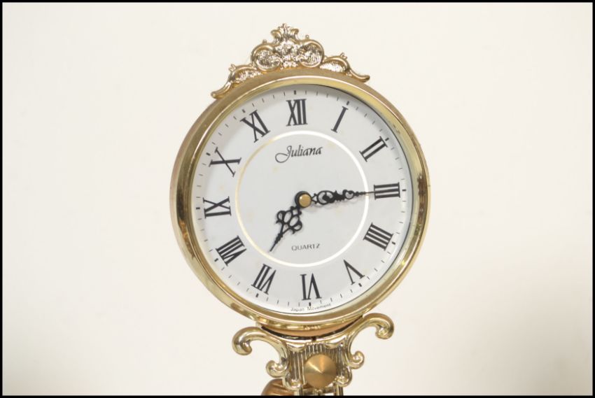 A contemporary Juliana figural pendulum quartz clock, the movement held aloft by two classical style scantily clad female figurines.  Measures 80cm high