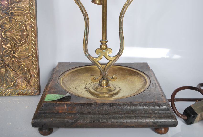 An early 20th Century wall mirror of rectangular form having an embossed brass frame with scallop shell design together with a brass table lamp raised on a stepped walnut base having two brass sconces with central loop handle. 50cms x 33cms