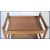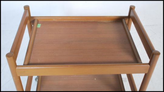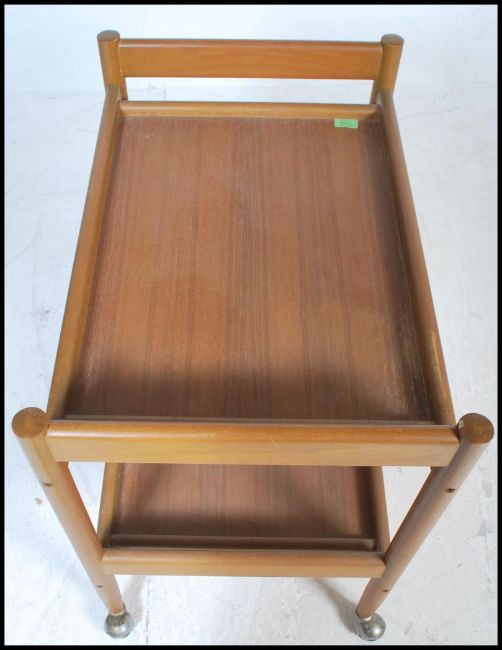 A retro 20th Century teak wood two tiered buffet / tea trolley the two gallery tiers united by turned stretchers with rail to both ends for moving, terminating on ball castors. Measures 76cm high x 74cm width x 50cm deep.