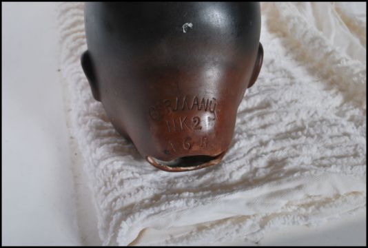 A vintage German made ceramic black dolls head having articulated glass eyes. Back of the neck marked Germany NK2 AGR.