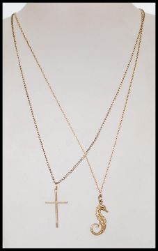 Two 9ct gold fine necklace chains and pendants to include a 9ct gold hallmarked crocodile pendant and a 9ct gold stamped crucifix pendant. Total weight 8.8