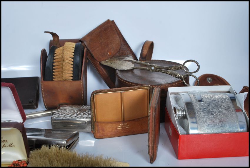 A group of mixed vintage curios / collectable items to include leather collar box and cased leather cloth brushes. Three cigarette cases, one being Japanese with inlay decoration depicting Mount Fuji with K24 monogram. A brass telescope, Voigtlander folding camera, skirt lifter, silver wrist watch with arabic numerals with hallmarks to iner case, cufflinks and a pair of coral earrings, sewing set, clove stretcher etc.