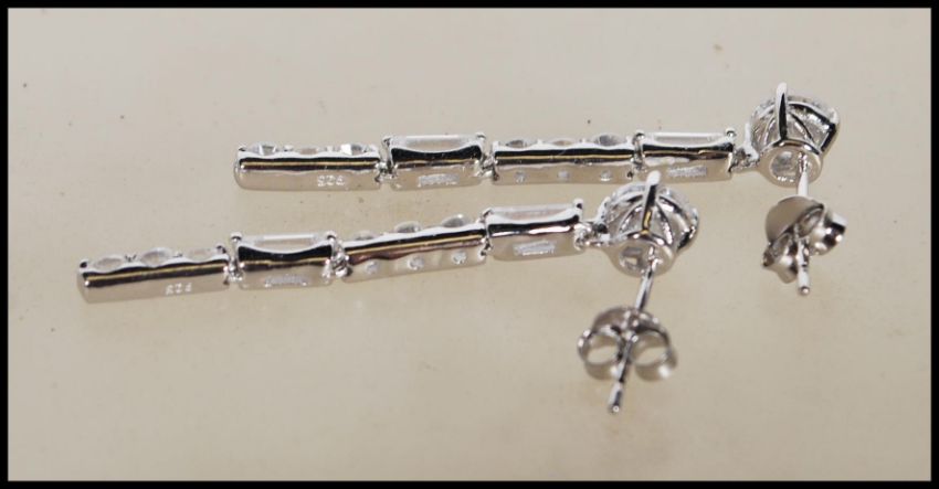 A pair of stamped 925 silver drop earrings set with Cz's. Stamped 925 to verso. Measure 1.5 inches long. Gross weight 3.4g.