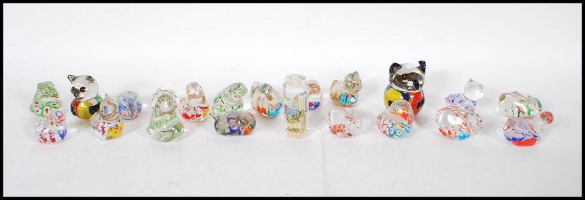 A collection of 20th Century glass animal paperweights in the form of a selection of animals having coloured millefiori decoration.