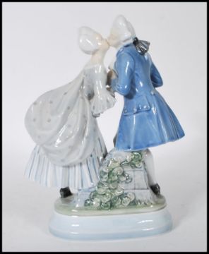 A Royal Copenhagen porcelain figurine depicting a Georgian couple kissing on a plinth base. Marks to base. No. 2046. Measures: 22 cms tall.