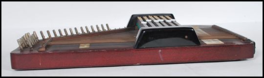 A vintage 20th Century wooden Autoharp musical instrument. Measures 47cm long by 26cm wide.