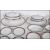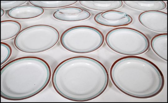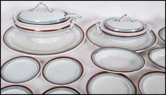 A 19th Century French childs miniature dinner service consisting of plates, platters, and tureens, having cream ground with burgundy and green striped decoration. 44 pieces in total. Largest tureen measures 11cm high and 15cm wide.