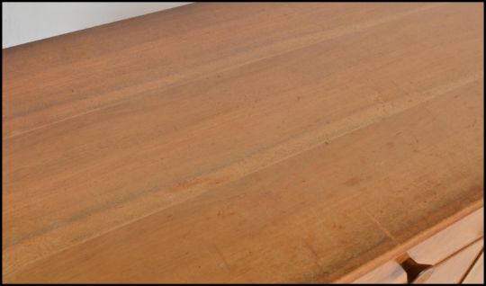 An original mid century Gordon Russell walnut sideboard / credenza. Raised on squared legs with a chest to centre flanked by end cupboards. Gordon Russell Broadway label to back panel. Measures 85cm high x 140cm wide x 49cm deep.