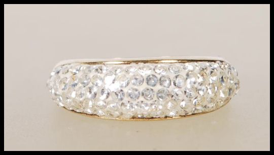 A stamped 375 9ct gold ladies cluster ring set with four rows of white accent stones to the head. Weight 3.2g. Size P.5.