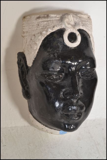 A 20th Century African cast plaster sculpture fragment of a man wearing a decorative white headdress, painted in black lacquered paint. Measures: 60cm high