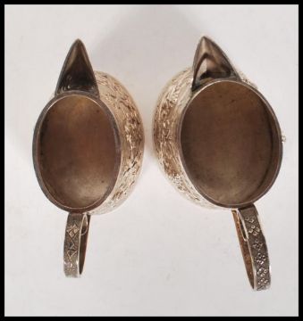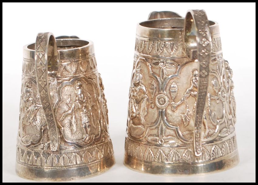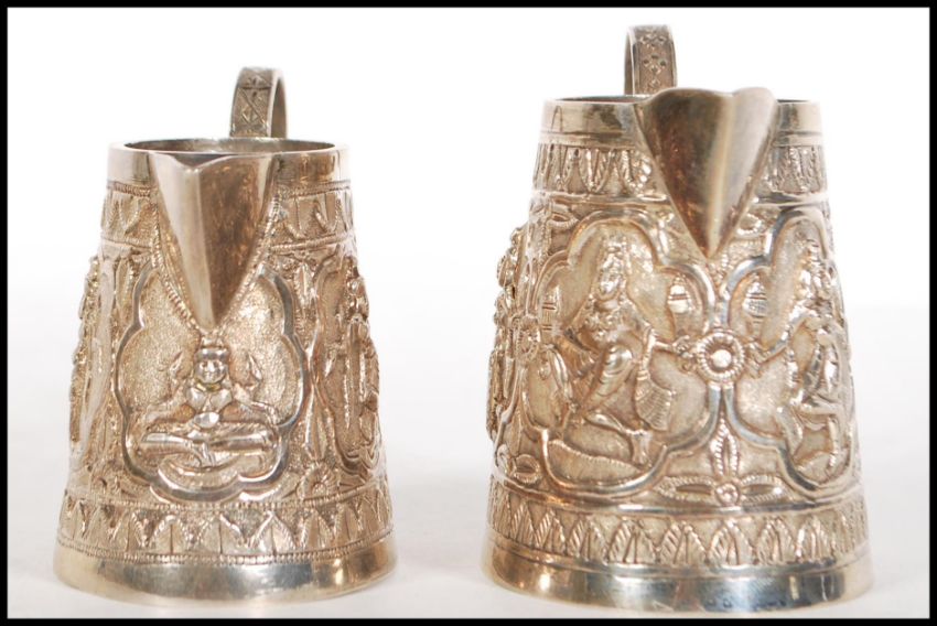 A pair of 20th Century South East Asian silver jugs of tapering form having embossed decoration of deities within cartouche panels to the sides and scrolled handles. Unmarked but test as silver. Total weight 216g. Tallest measures 9cm tall from the top of the handle.