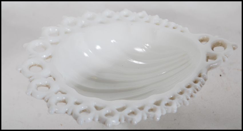 A 19th Century pressed milk glass centrepiece bowl having pierced decoration 'lace' rim, together with a set of six scallop shell dishes.