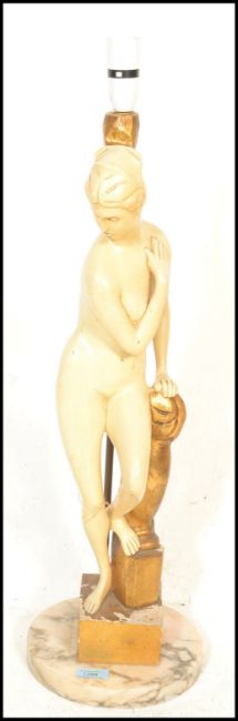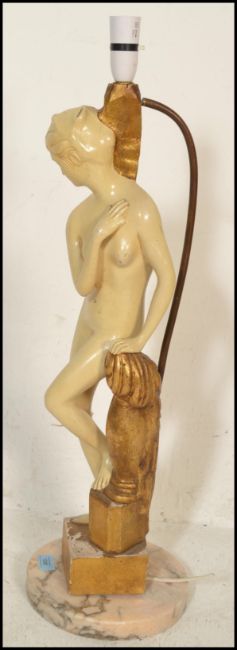An early 20th Century chalk ware table lamp by Oliver Messel modelled as a classical figure of a nude lady leaning on a tree, The lamp from Flaxley Abbey and designed and installed by the man himself. 76cms high.