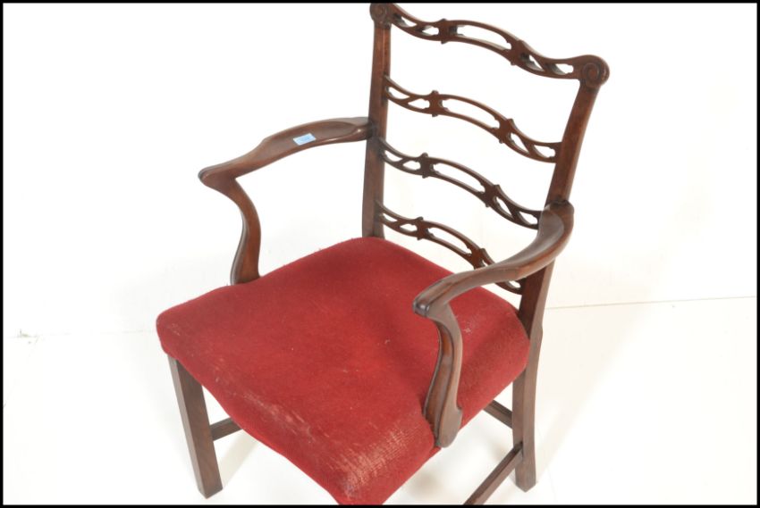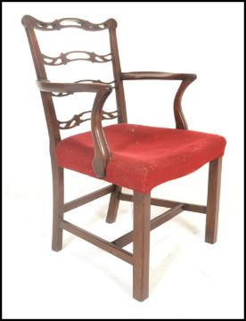 A 19th century Georgian mahogany Chippendale revival office desk chair. Raised on squared legs united by stretchers having an overstuffed seat with scrolled elbow rests, the back with pierced railed back. Measures: 90cm high x 62cm wide x 54cm depth.