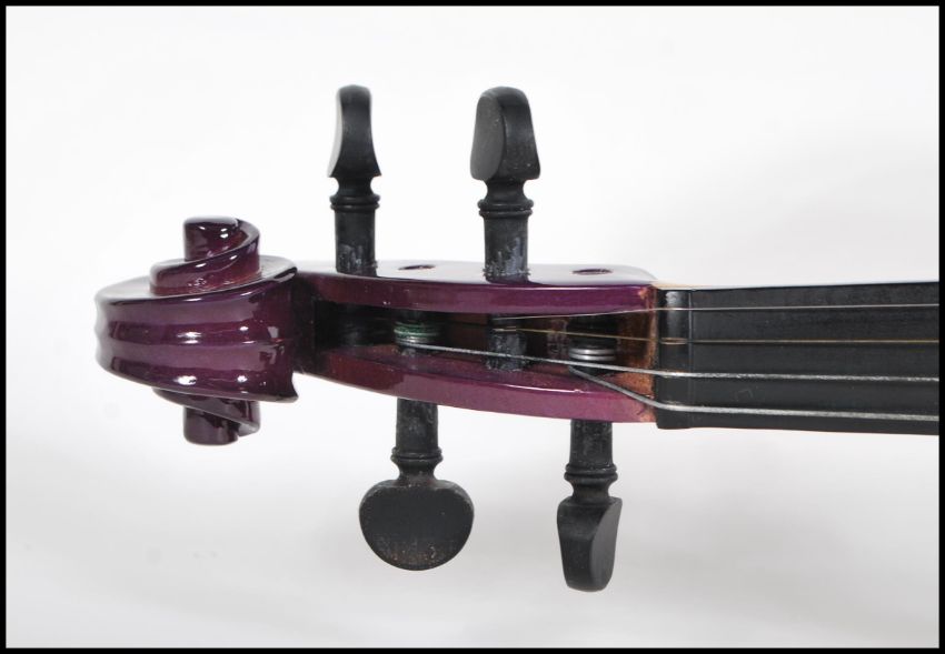 A 20th Century cased student violin, the hollow body having an Aubergine purple finish, cased with bow.