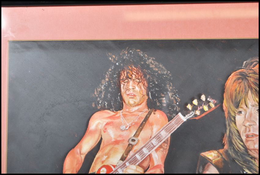 A original acrylic painting on paper depicting classic rock legends Slash and Randy Rhoads on a black ground. Signed Jamie L. Framed and glazed. Measures: 45cm high x 47cm wide.