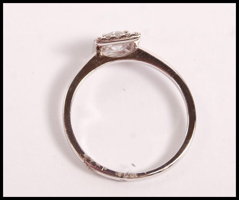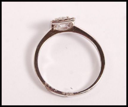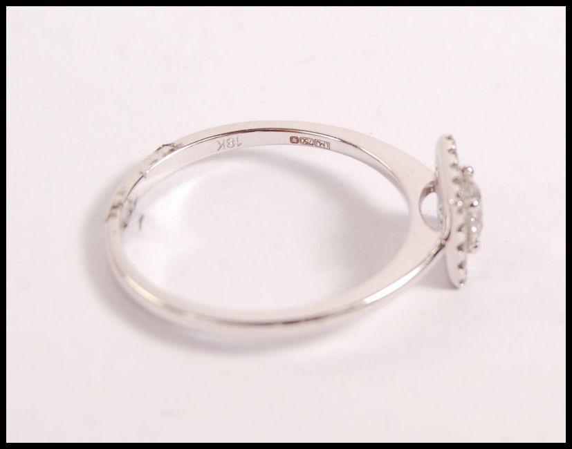 A stamped 18ct white gold ring set with a brilliant cut diamond in a square halo set with further diamond accent stones. Weight 2.2g. Size M.5. Diamonds estimated at 55pts.