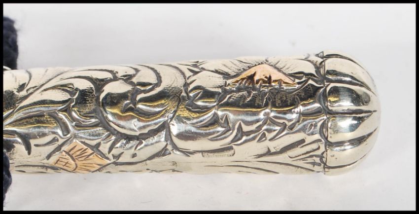 A 20th Century walking stick cane of tapering form having silver white metal embossed foliate decorated handle (believed indian silver) and blue tassel. With ebony shaft and brass ferrule. Measures 96cm long.