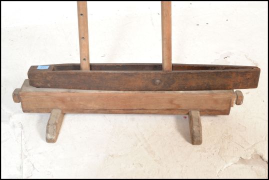 A 19th century Weaving / weavers stand of wooden form with turned uprights on stand having adjustable thread holes etc. Measures: 80cm high x 90cm wide.