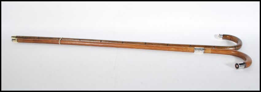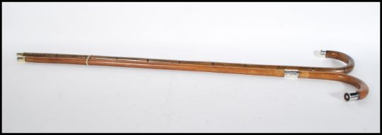 Two early 20th Century walking stick canes having crook handles. One being bamboo with a silver tip and brass ferrule, hallmarks for Birmingham date letter B 1926, makers mark for C & S. The other being bamboo with a shotgun shell tip with silver collar, hallmarks rubbed  with brass ferrule. Longest measures 93cm long.