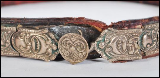 An unusual silver plated on bronze articulated belt applied to leather, believed late 19th early 20th century having Art Nouveau design to each metal mount being threaded to the leather strap. Measures 90cm length.