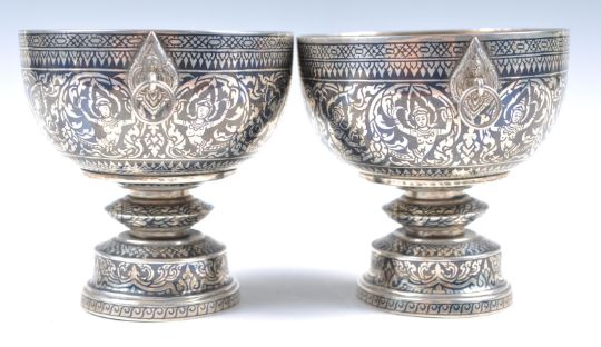 A pair of early 20th Century Thai Thailand Niello silver goblets of three parts raised on a circular pedestal foot with single bladed knop stem and engraved bowl. Profusely decorated with scenes of Buddha and scrollwork. Twin ring handles to sides. Carved silver nut to base allowing dismantling of goblets. Measures 7.5cm tall. Weighs 219.7 grams.