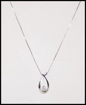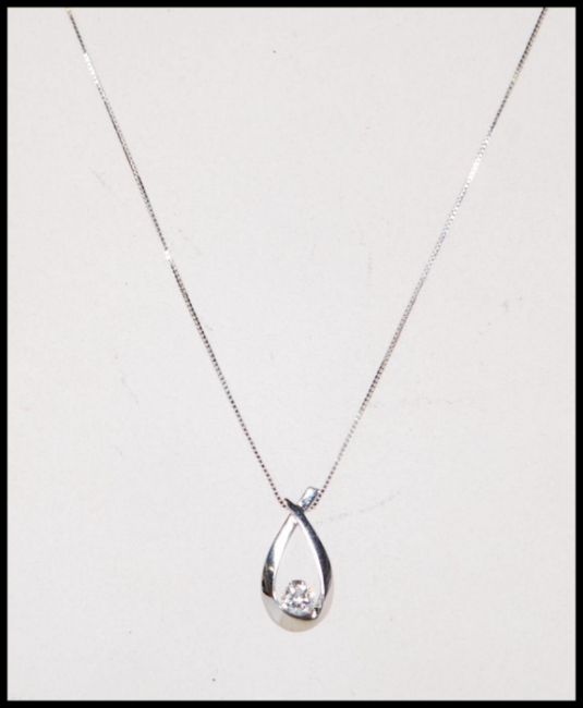 A 10ct white gold and diamond necklace and pendant being originally from the north of Canada. Set to a 10ct white gold box link chain with spring hoop clasp the pendant of crossover form with central white stone. Chain measures 22cm long. Weighs 1.6 grams.