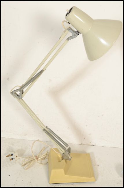 A group of three vintage 20th Century angle poise desk top lamps, all having a white enamelled finish, two raised on round bases (model 90) and the other on a rectangular form base. Measures: 85cm high.