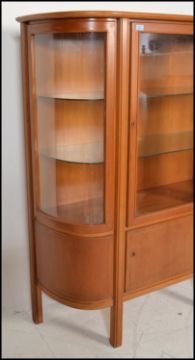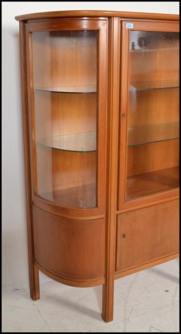A vintage  early 20th century French Art Deco style bow fronted glazed vitrine display cabinet / bookcase. The cabinet with central  glazed door over panels beneath. The interior with adjustable glass shelves. All raised on squared legs beneath. Measures 155cms x 115cms x 35cms.